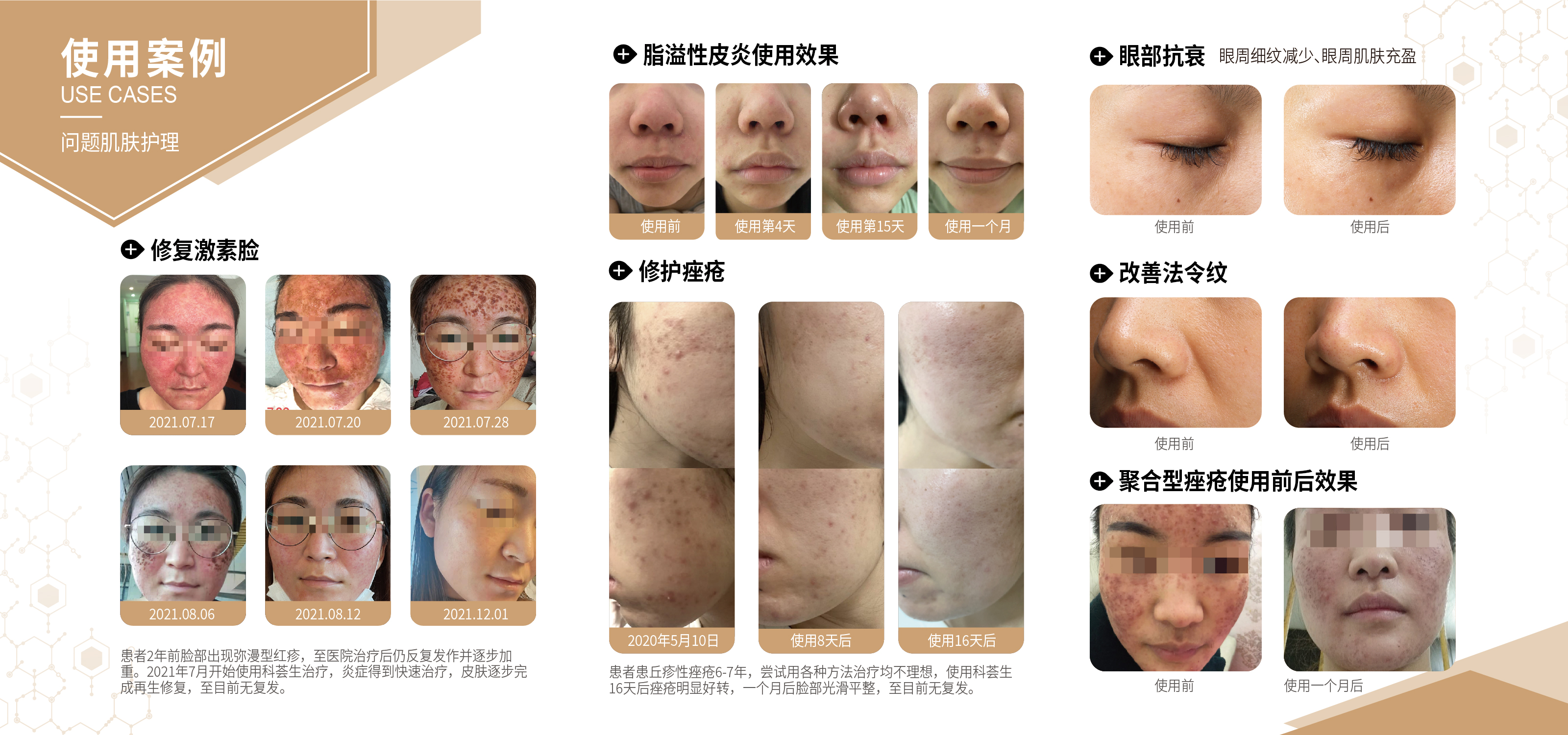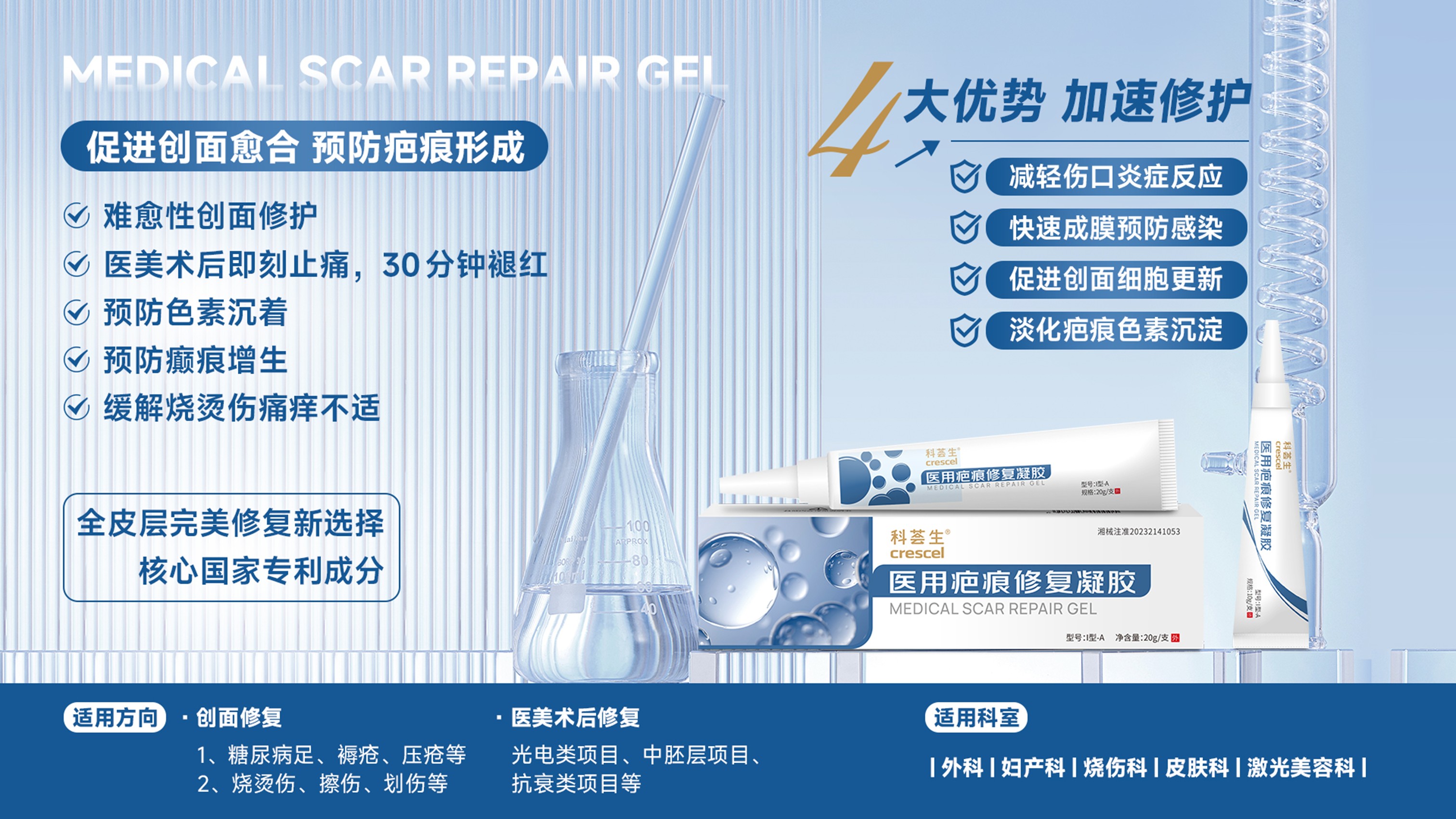 科荟生医用疤痕修复凝胶具有控制炎症、预防感染、促进愈合、淡化色沉等功效,对于难愈性创面的修护效果显著。